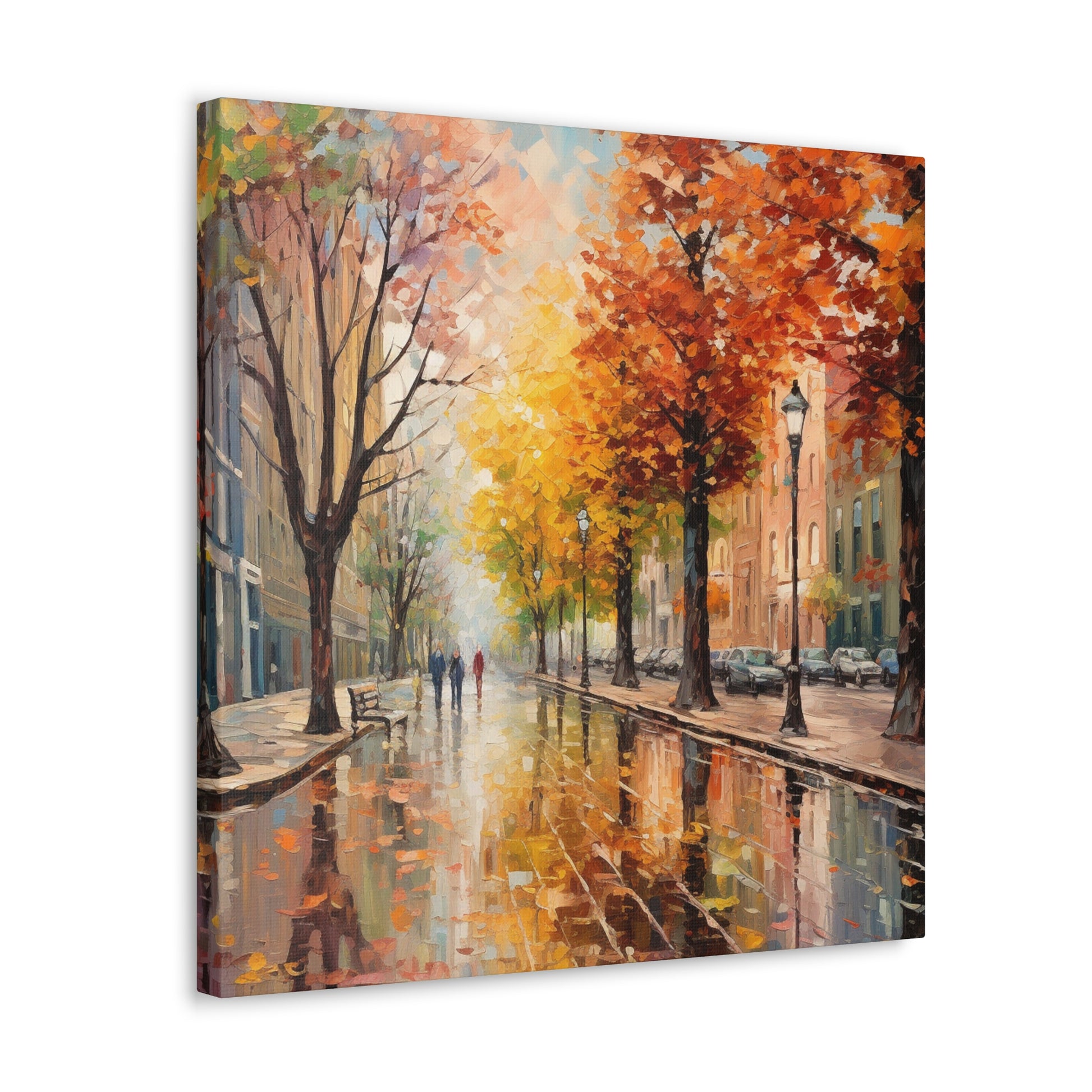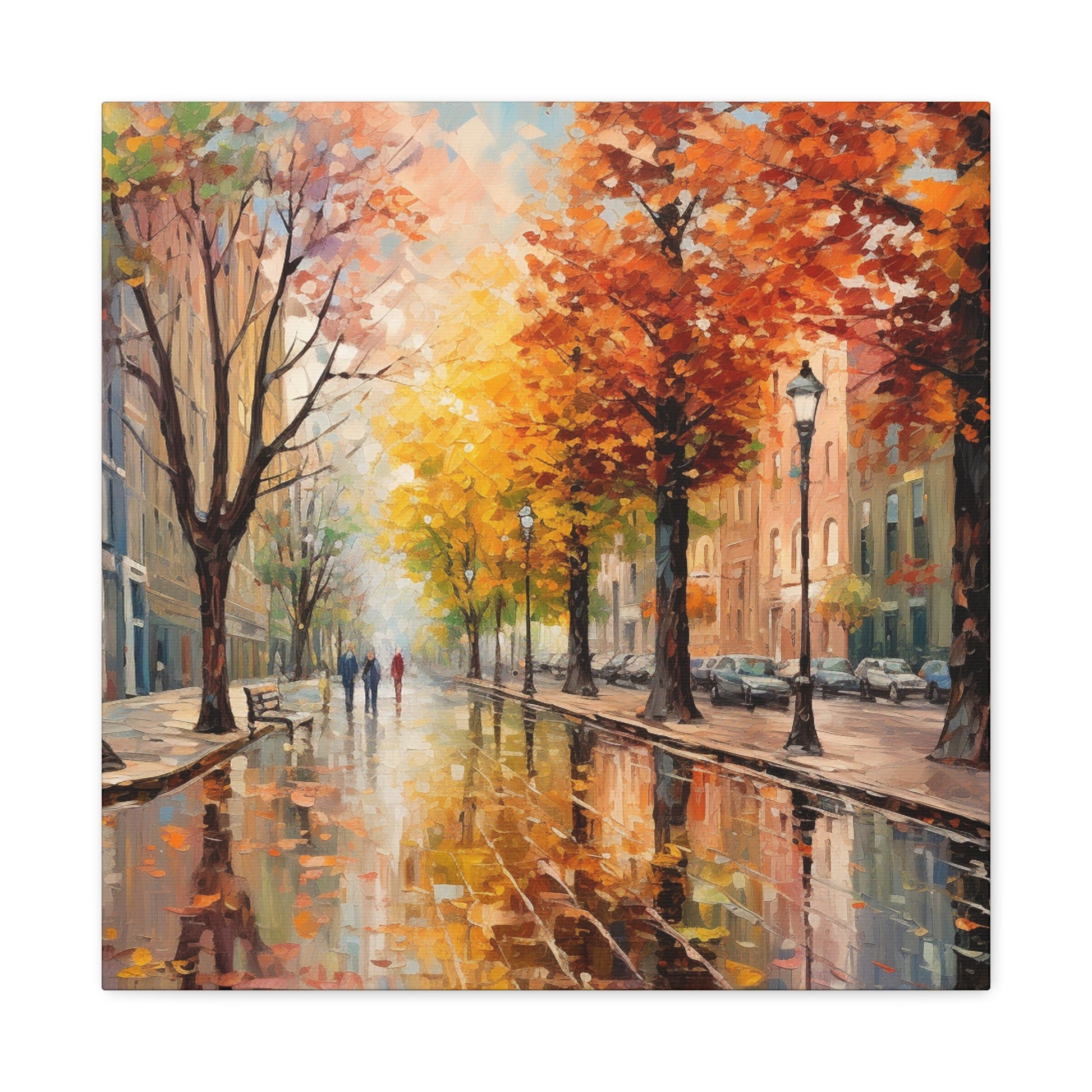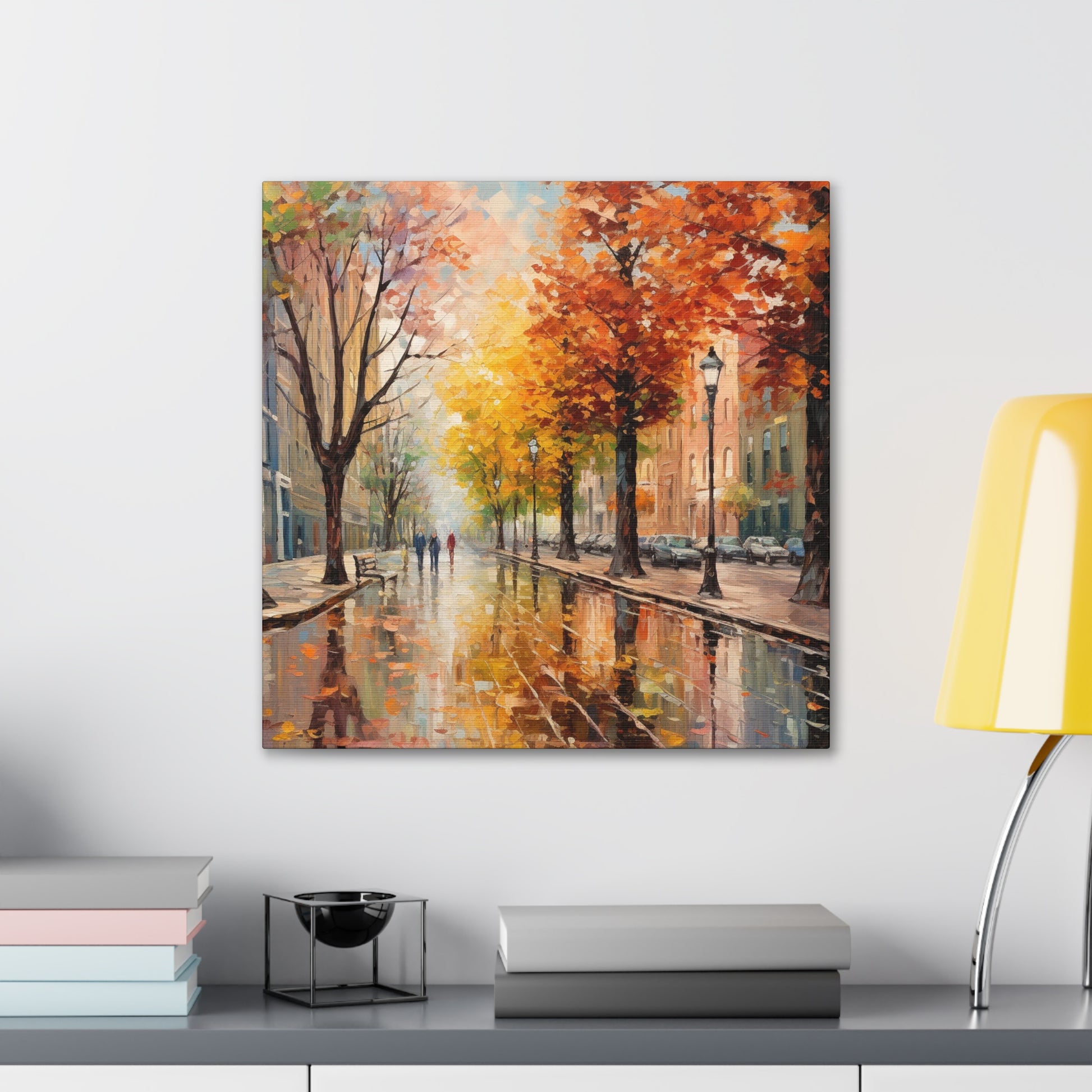 This canvas is a perfect marriage of nature and the urban scene, featuring a vibrant impressionistic painting of falling leaves in a city. These unique 1:1 designs highlight the beauty of the ever-changing autumn landscape, adding an unexpected splash of color to any wall. #Impressionism #Art #Canvas #Fall #Leaves #City #Autumn #UniqueDesign #Nature #Urban #Painting
