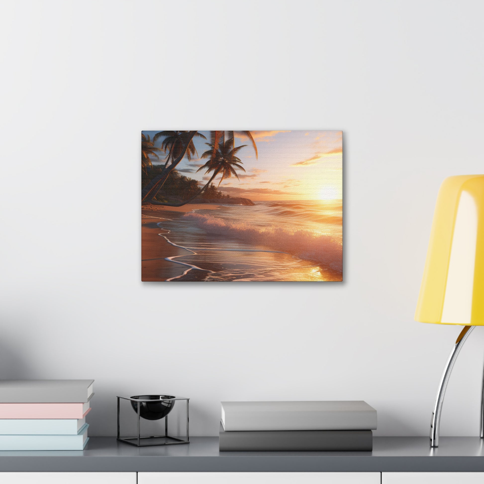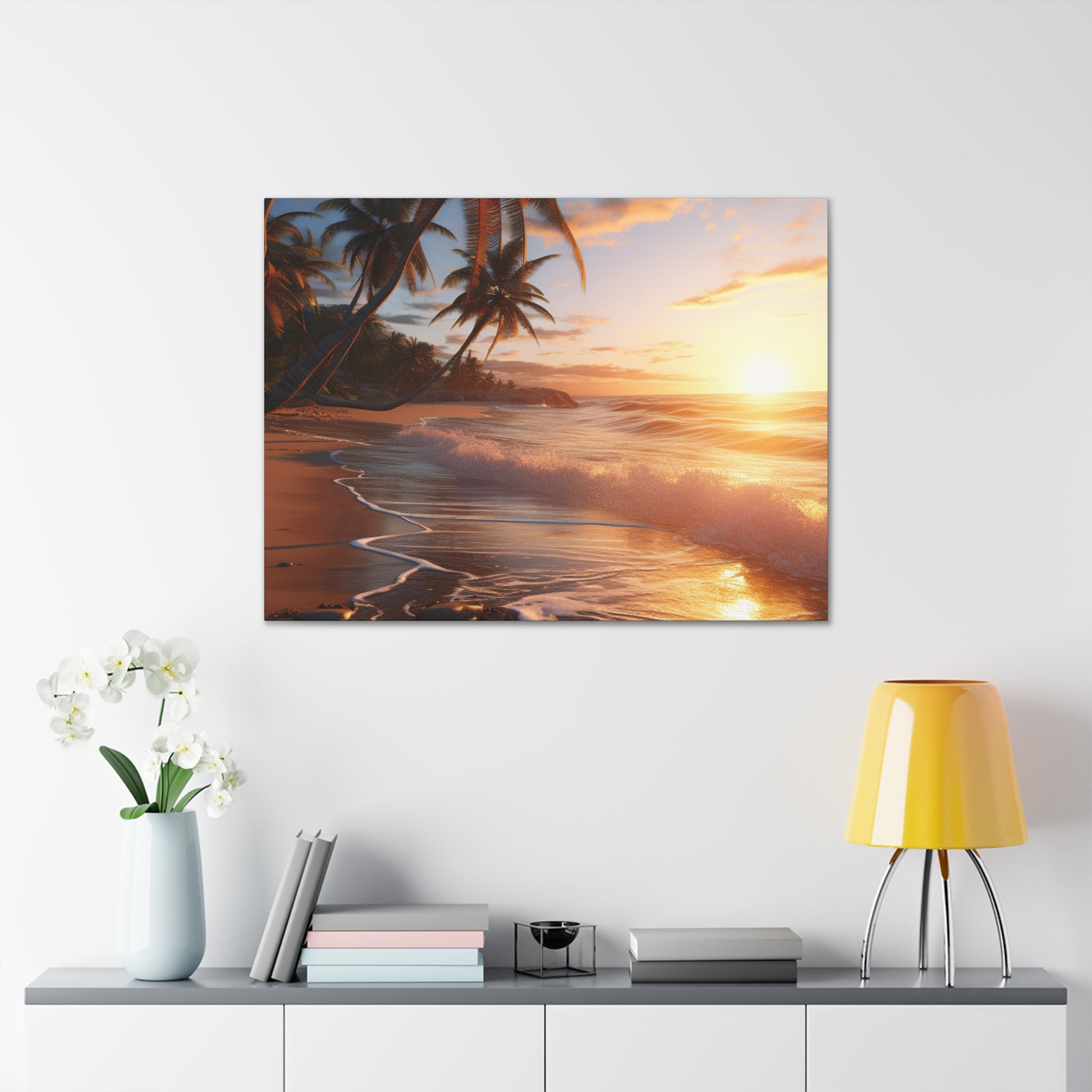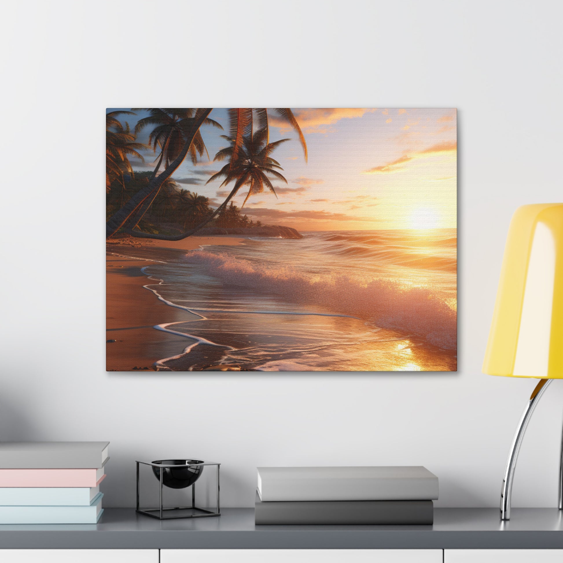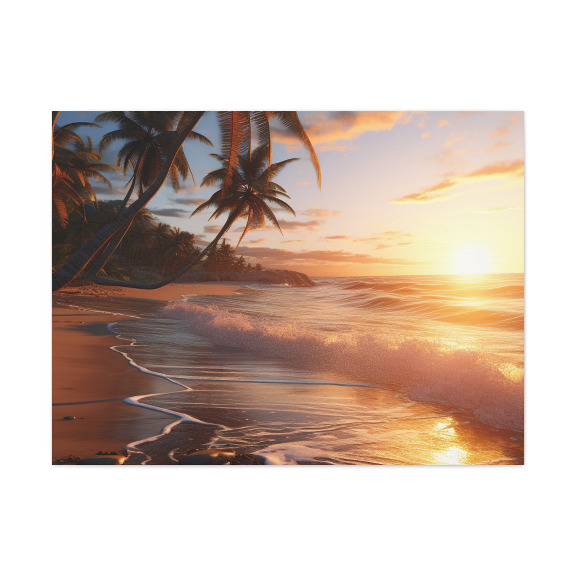 Bring a stunning piece of decor to your home and office with the Photorealistic Tropical Beach at Sunset-AR 4:3 Designs canvas print. Its incredible detail and vibrant colors will create a stunning atmosphere perfect for relaxation. Each piece is printed on high-quality cotton canvas then stretched onto a durable wooden frame. The perfect wall art for any home or office! #wallart #canvas #canvasprint #homeart #beachart #oceanart #ar3d #relaxation #painting #gentletouch #sunsetart #tropicalart